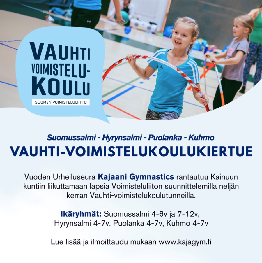 Tervetuloa mukaan Vauhti-voimistelukoulutunneille! Kajaani Gymnastics rantautuu Kainuun kuntiin liikuttamaan lapsia Voimisteluliiton suunnittelemilla neljän kerran Vauhti-voimistelukoulutunneilla. Syksyllä 2025 kierrämme Suomussalmella, Hyrynsalmella, Puolangalla ja Kuhmossa.